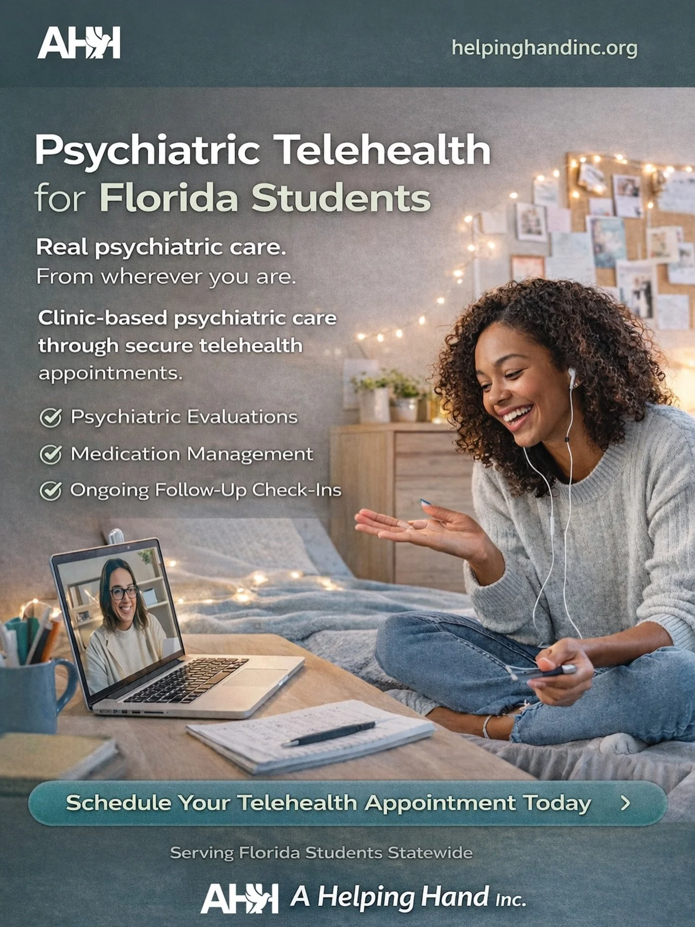 Built for student schedules and real life. A Helping Hand Inc provides clinic-based psychiatric care through secure telehealth appointments, including psychiatric evaluations, medication management, and ongoing follow-up check-ins.